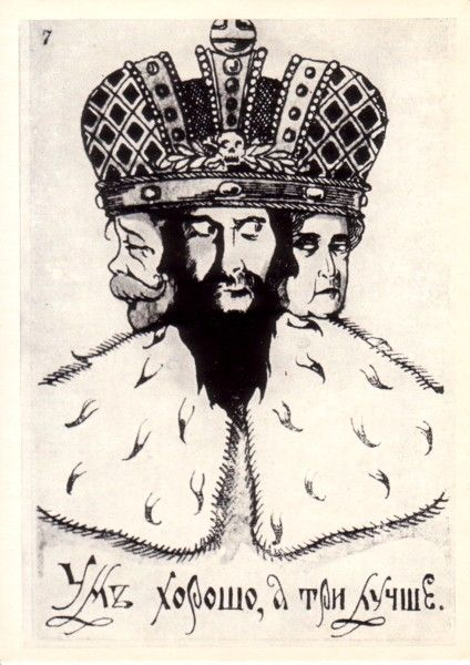 “Una testa va bene, ma tre sono meglio”. Caricatura di Nicola II, dell’imperatrice Aleksandra Fjodorovna e di Grigorij Rasputin, 1917